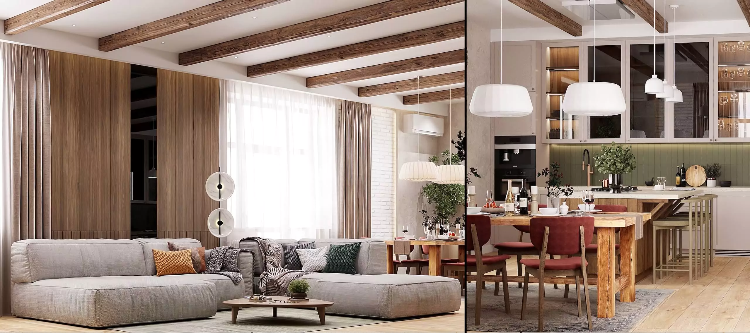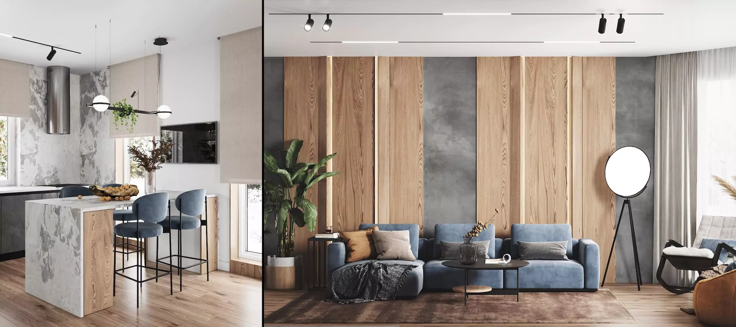 Хотя загородный дом даёт больше простора, мы придерживаемся схожих принципов и при работе над интерьером квартиры в современном стиле. Эргономика, визуальная лёгкость, функциональность и ощущение «моего» пространства — остаются на первом месте.