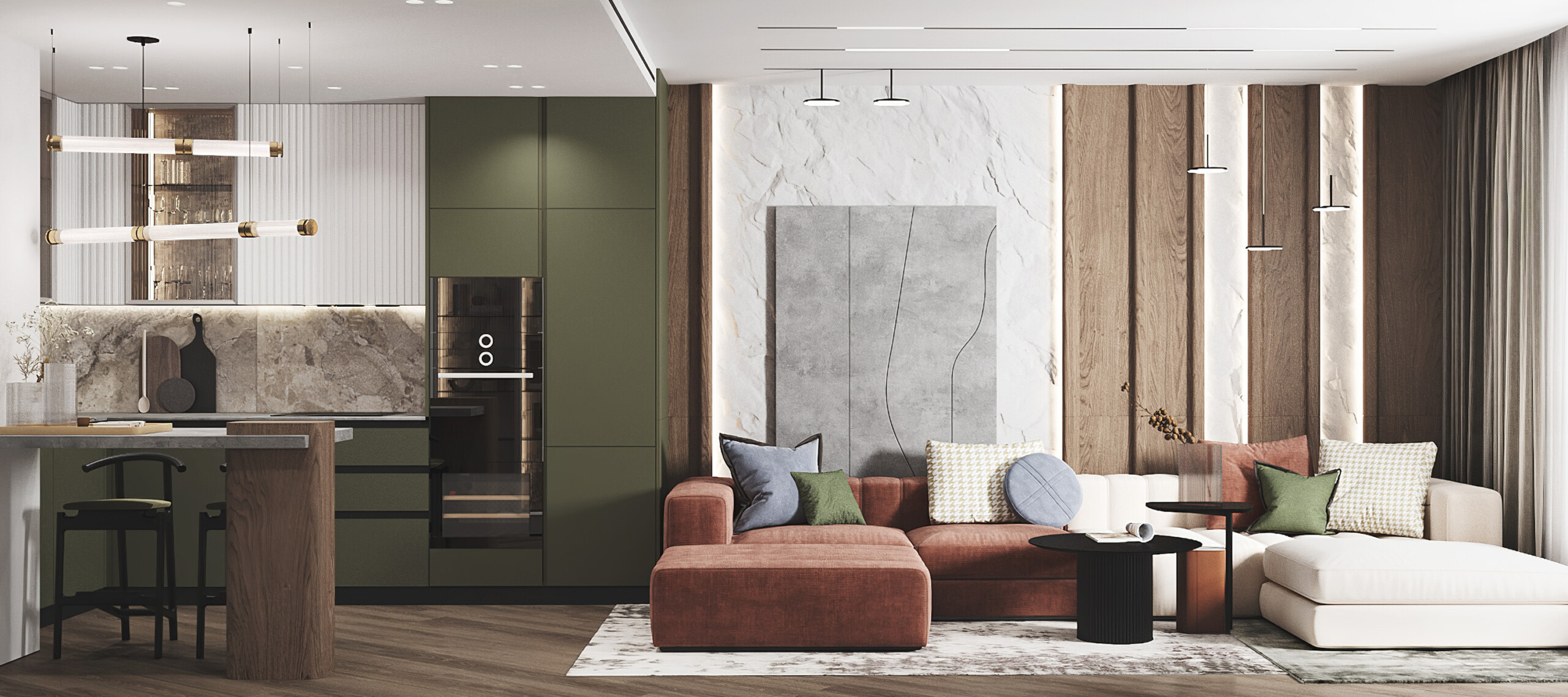 Чтобы кухня-гостиная в квартире выглядела цельно, важно выдержать единый стиль. Современный стиль в интерьере позволяет легко объединять разные функции: лаконичные фасады кухни поддерживаются спокойной палитрой гостиной, а акцентные текстуры и свет добавляют глубину пространству. Мы в Neapol Design всегда проектируем кухню и гостиную как единое целое, избегая ощущения «двух разных комнат».
