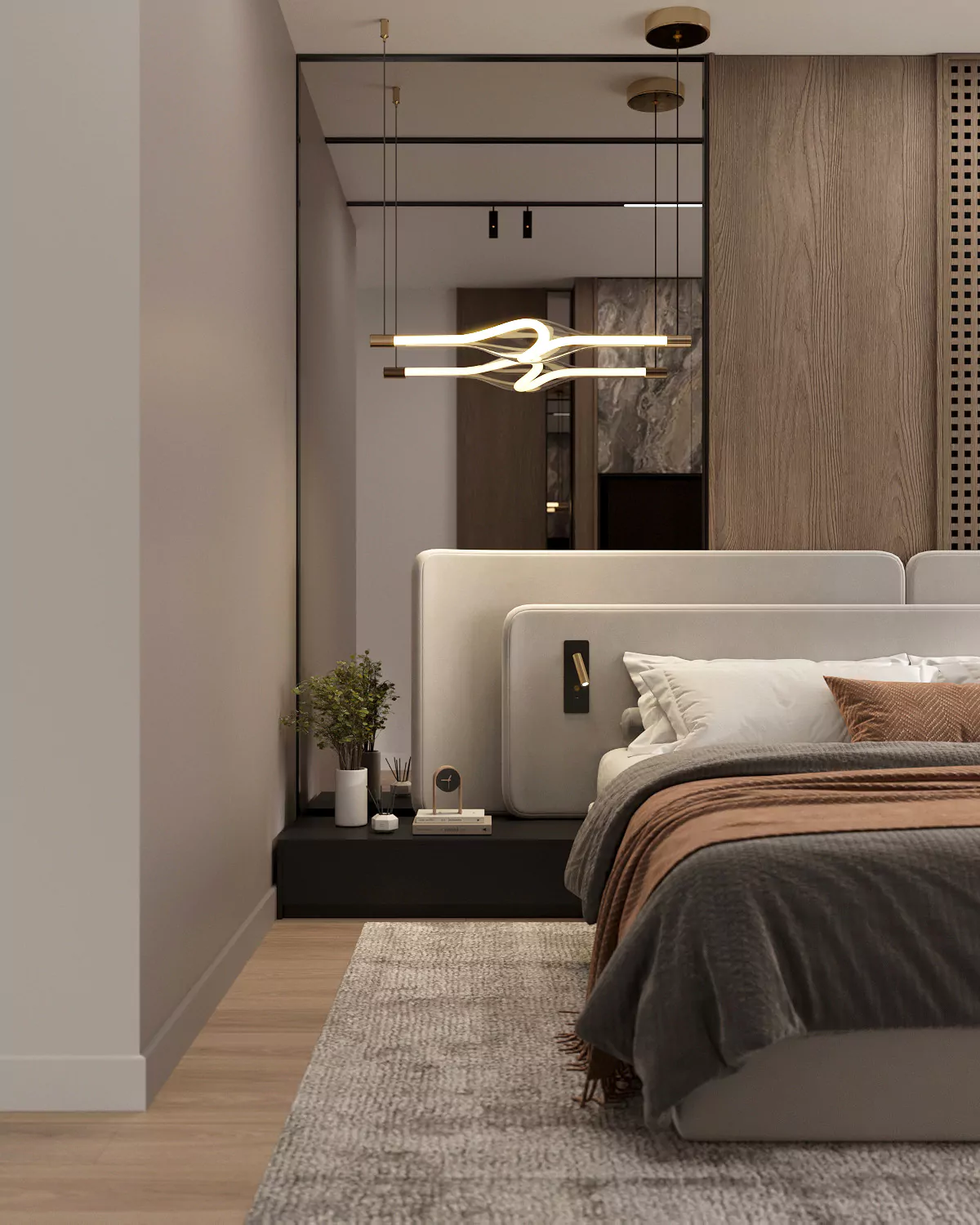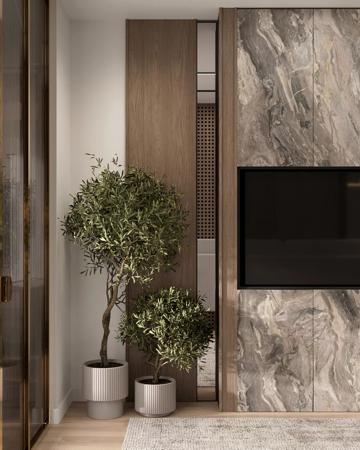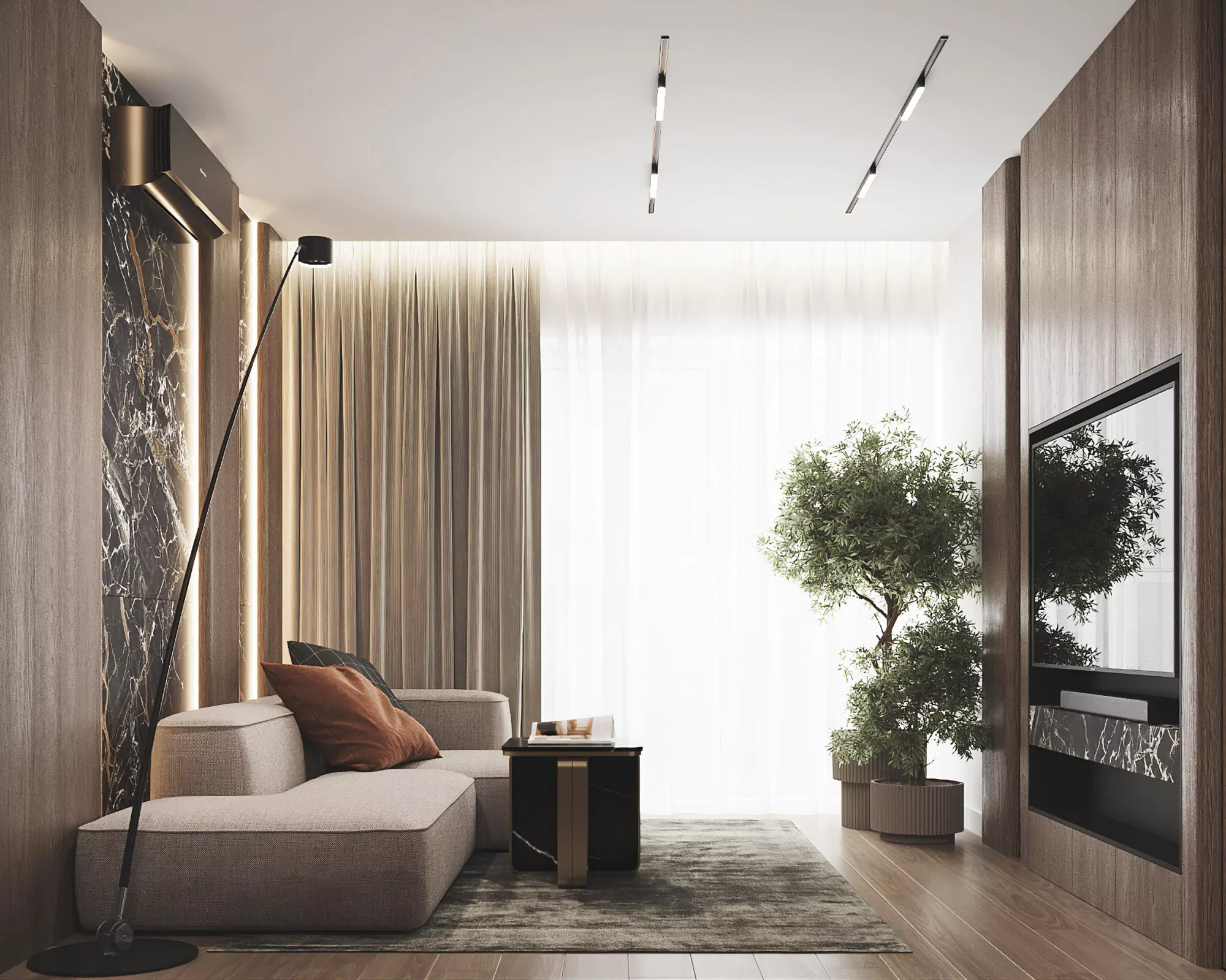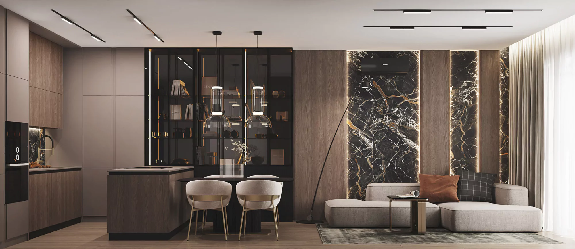 Элегантный дизайн интерьера квартиры площадью 120,4 м² в ЖК «Клевер Парк» в Екатеринбурге отражает стиль, уверенность и тонкое чувство эстетики владельцев. Пространство оформлено в глубоких оттенках с тёплыми акцентами терракоты и дерева. Натуральный камень, матовые текстуры, текстиль в мягких тонах создают атмосферу уюта и благородства. Архитектура квартиры подчёркнута светом и симметрией планировки. Этот интерьер — не просто оформление, а полноценный образ жизни, где каждая деталь подчинена логике и гармонии. Реализован с полным сопровождением студии Neapol.