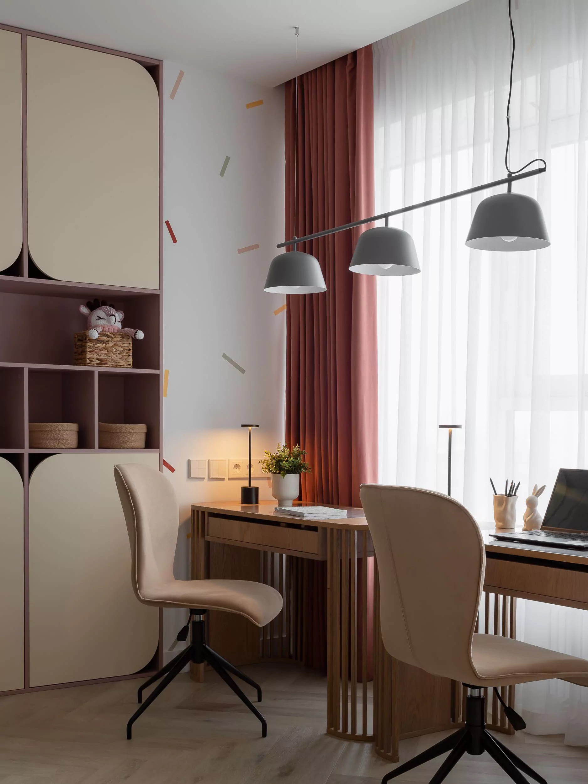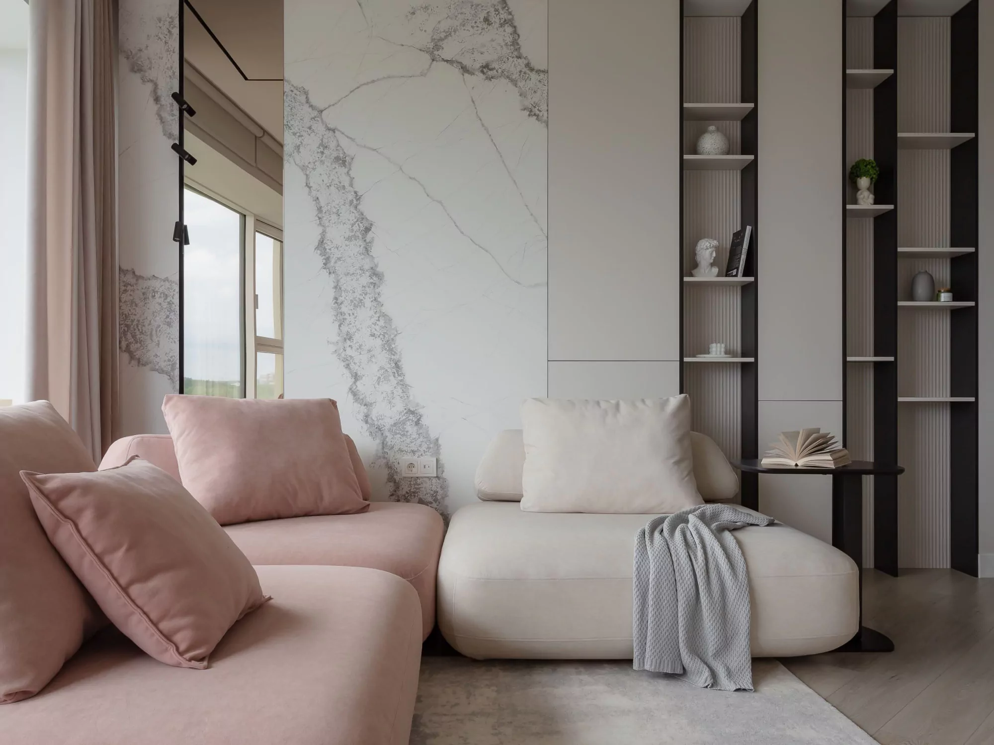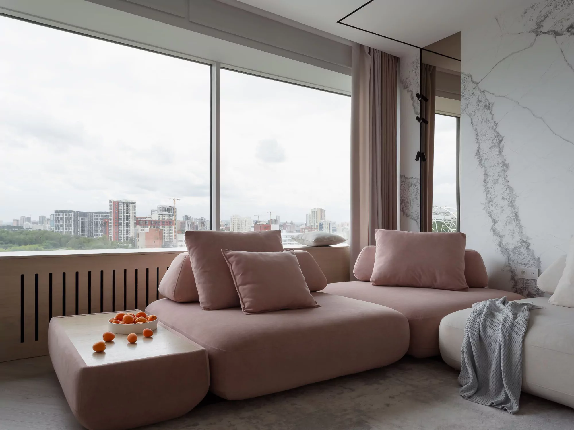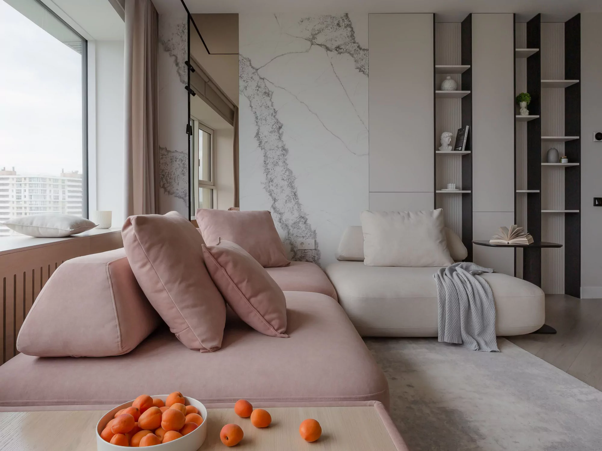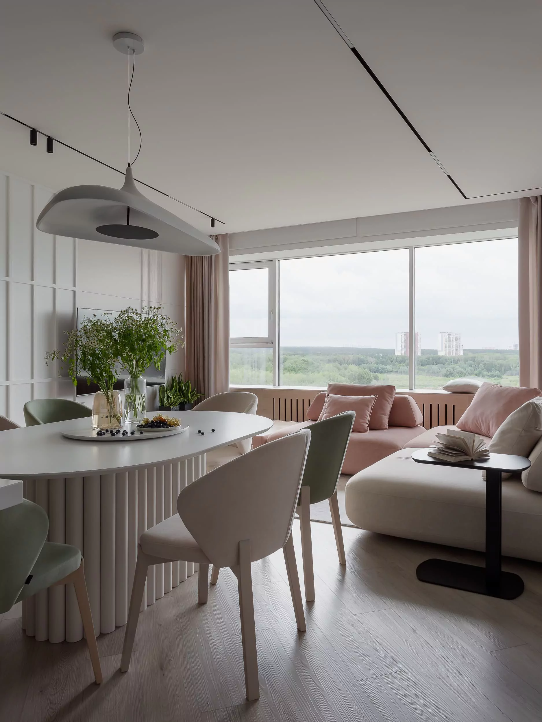 Живые фото реализованного интерьера в ЖК Клевер парк. Трапецевидные формы помещений радиальной квартиры добавили динамики, не потеряв в функциональности и эстетике. Мы использовали самые мягкие, пастельные и пудровые оттенки, чтобы добиться желаемого клиентам ощущения легкости и воздушности.