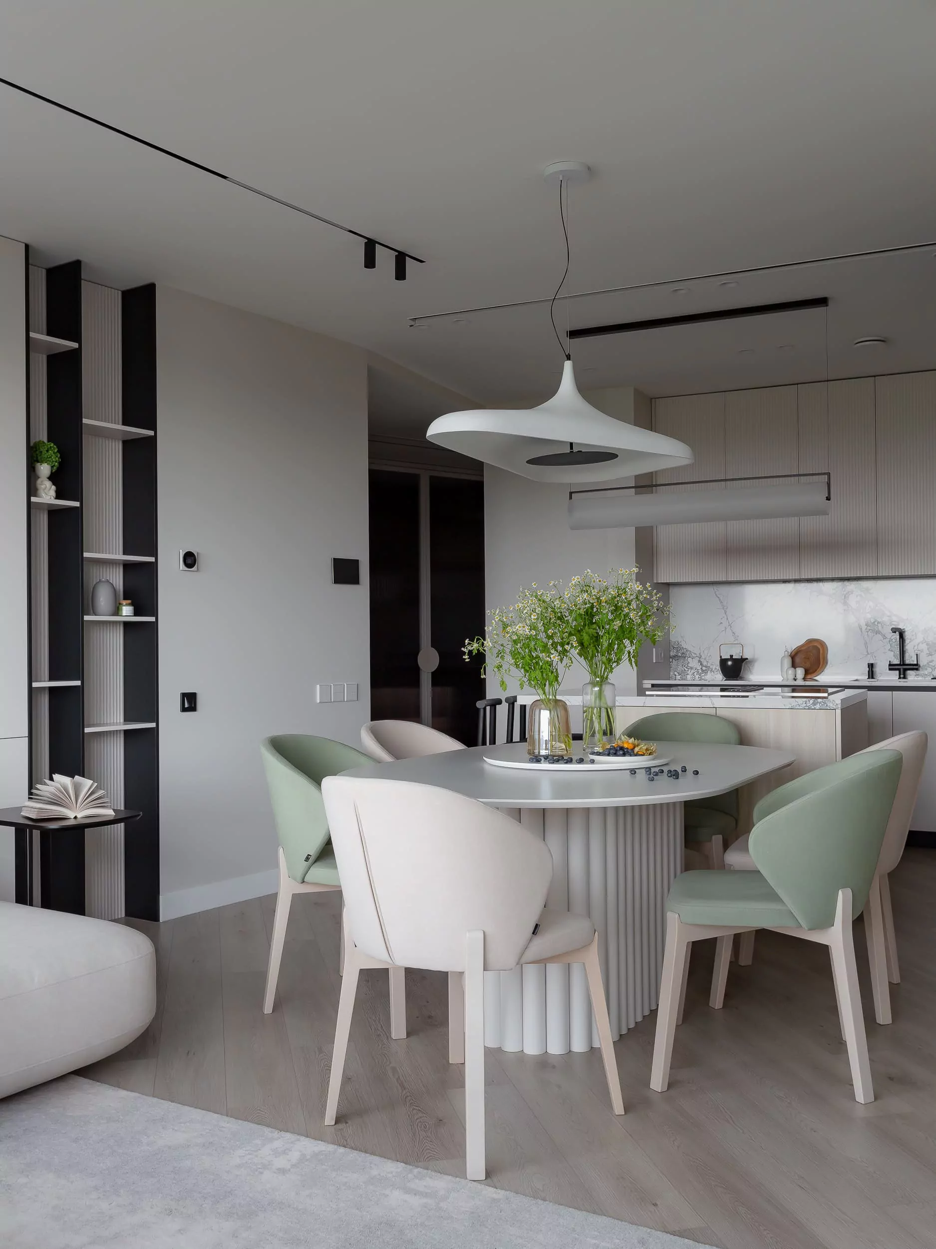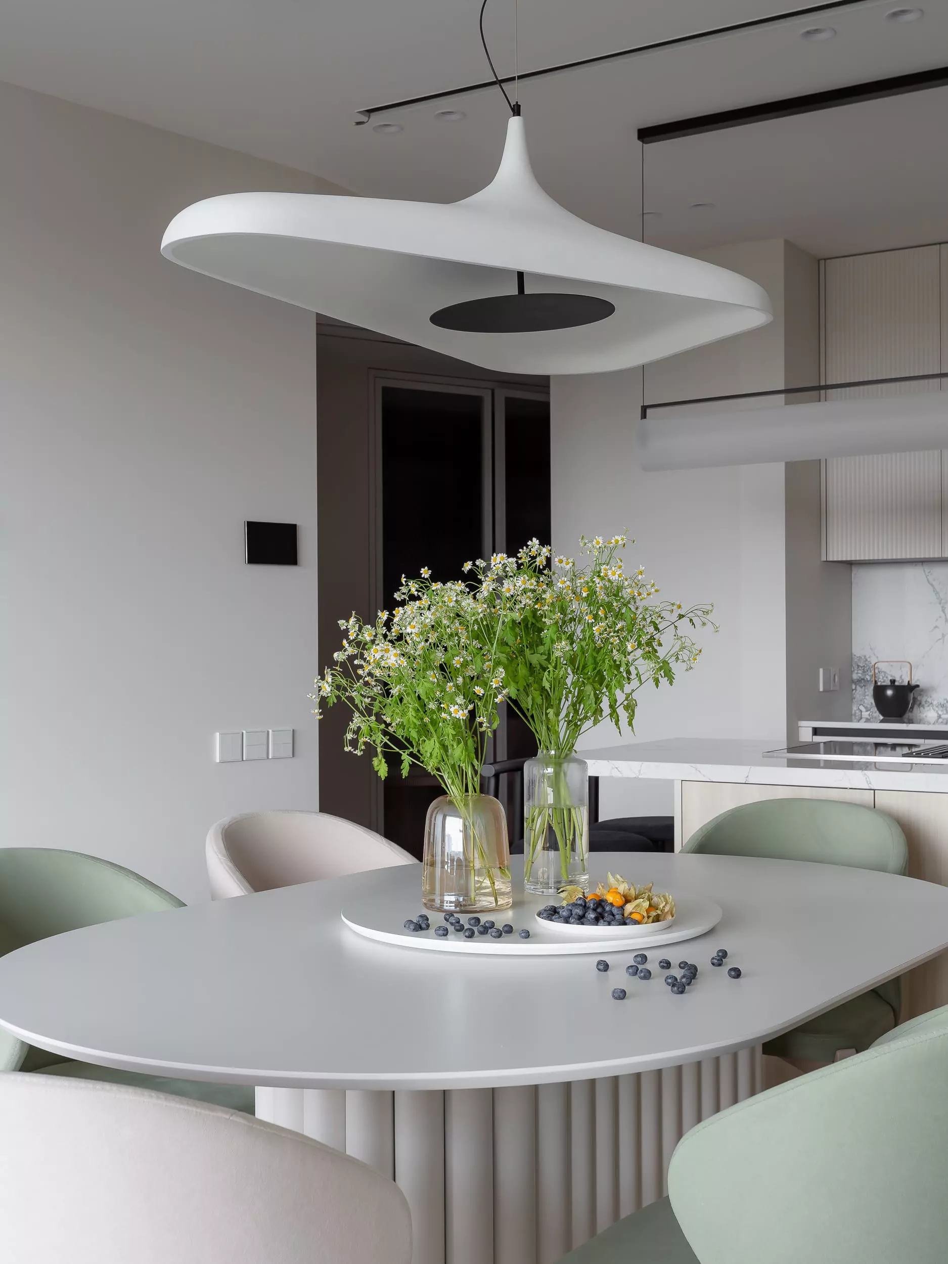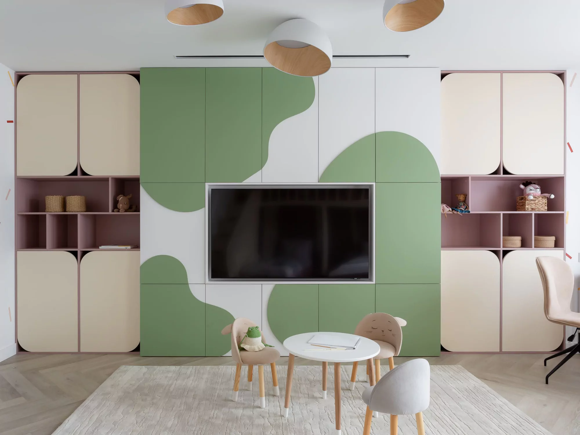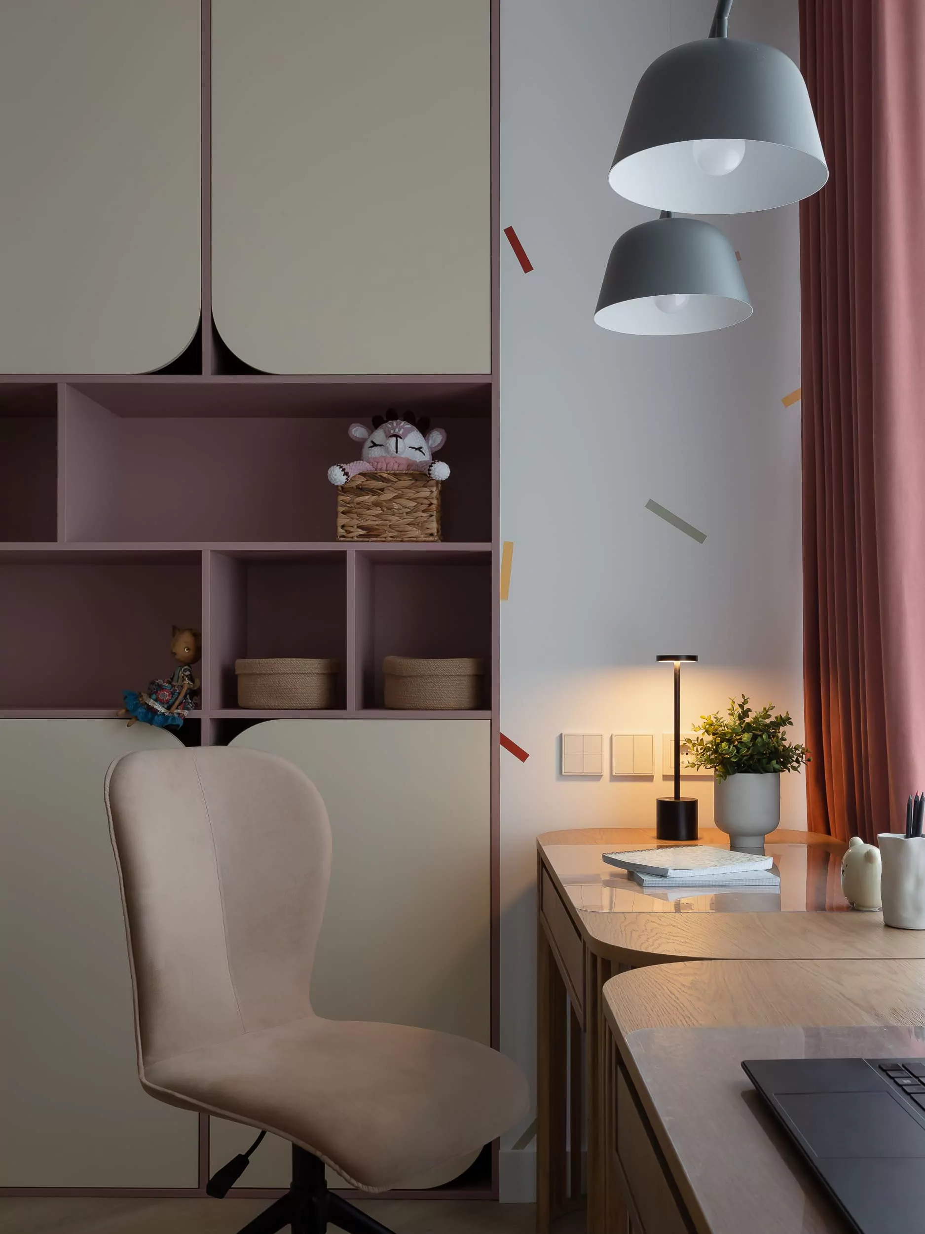 Живые фото реализованного интерьера в ЖК Клевер парк. Трапецевидные формы помещений радиальной квартиры добавили динамики, не потеряв в функциональности и эстетике. Мы использовали самые мягкие, пастельные и пудровые оттенки, чтобы добиться желаемого клиентам ощущения легкости и воздушности.