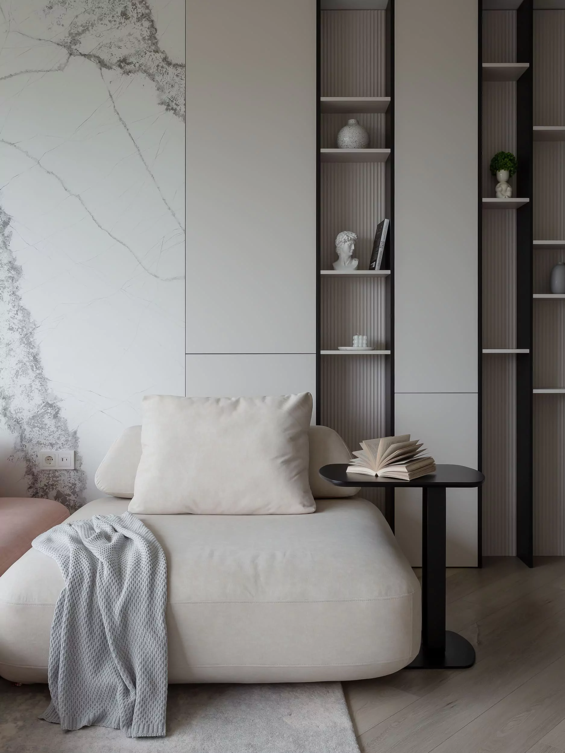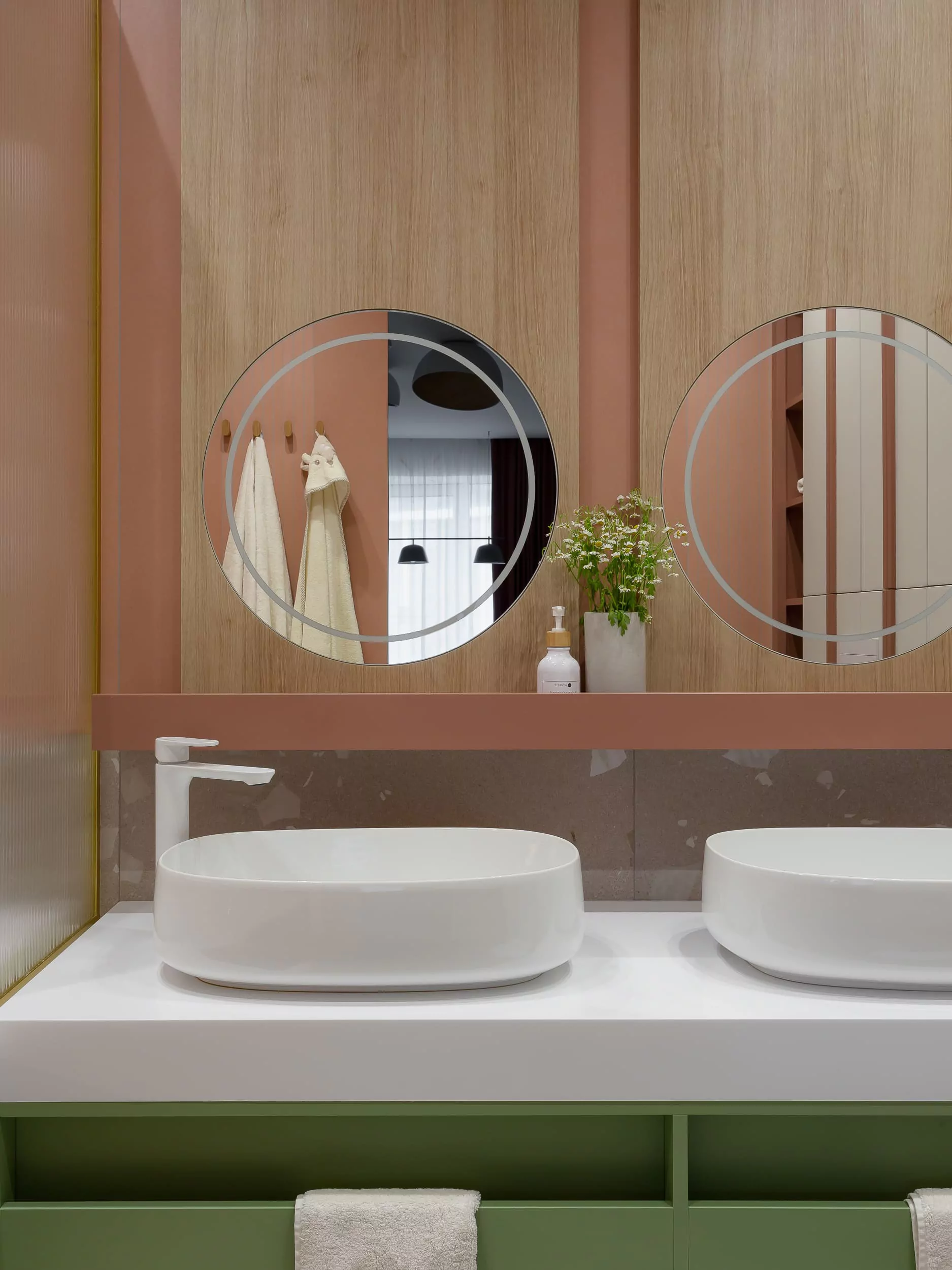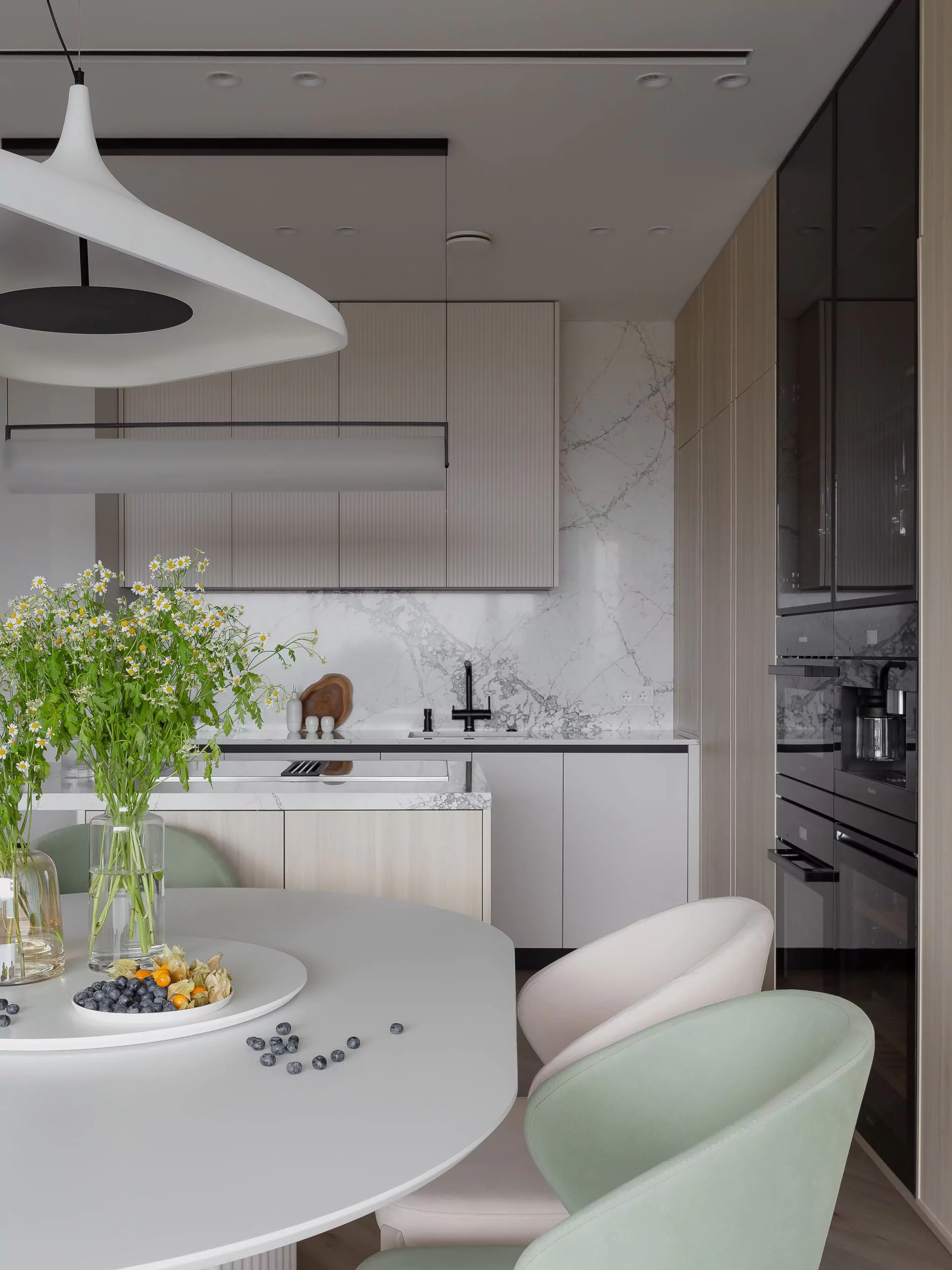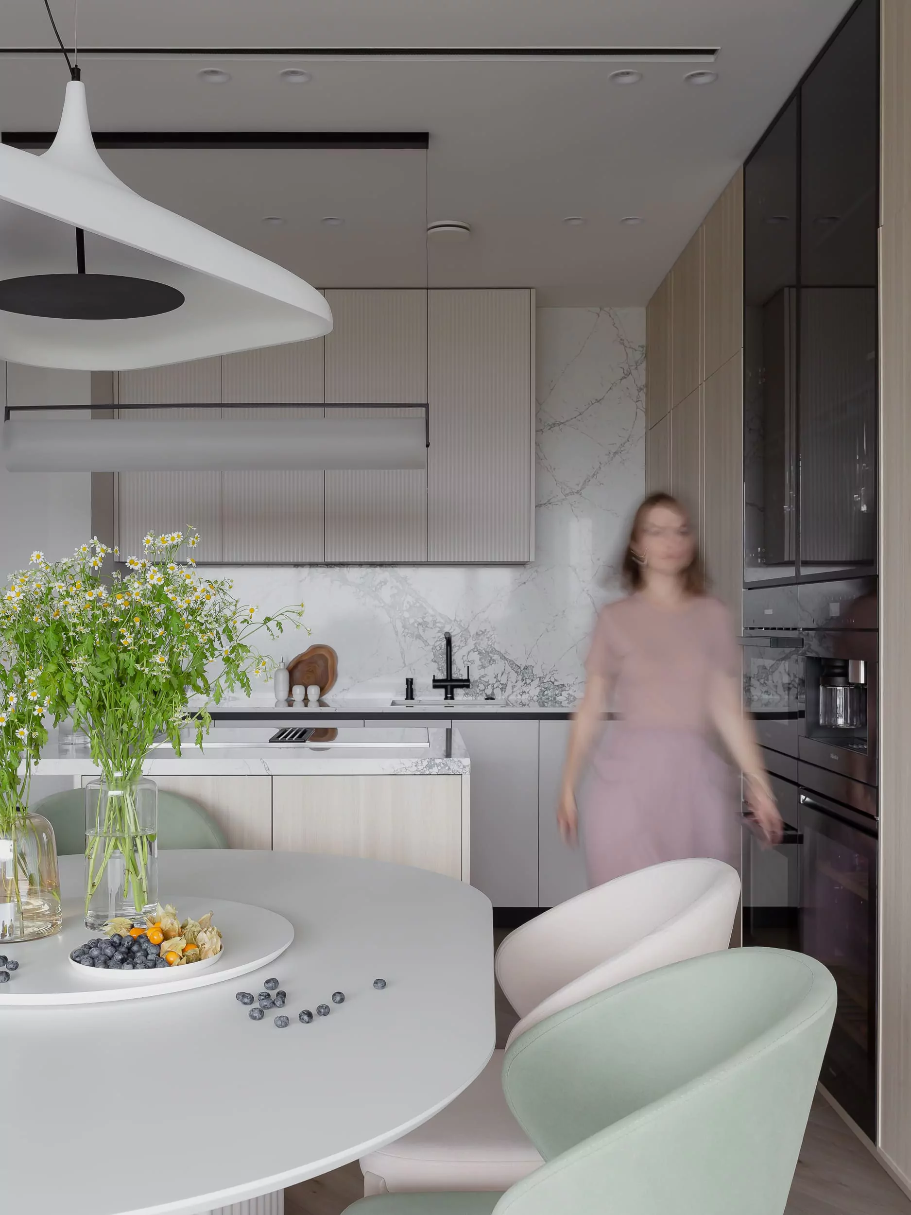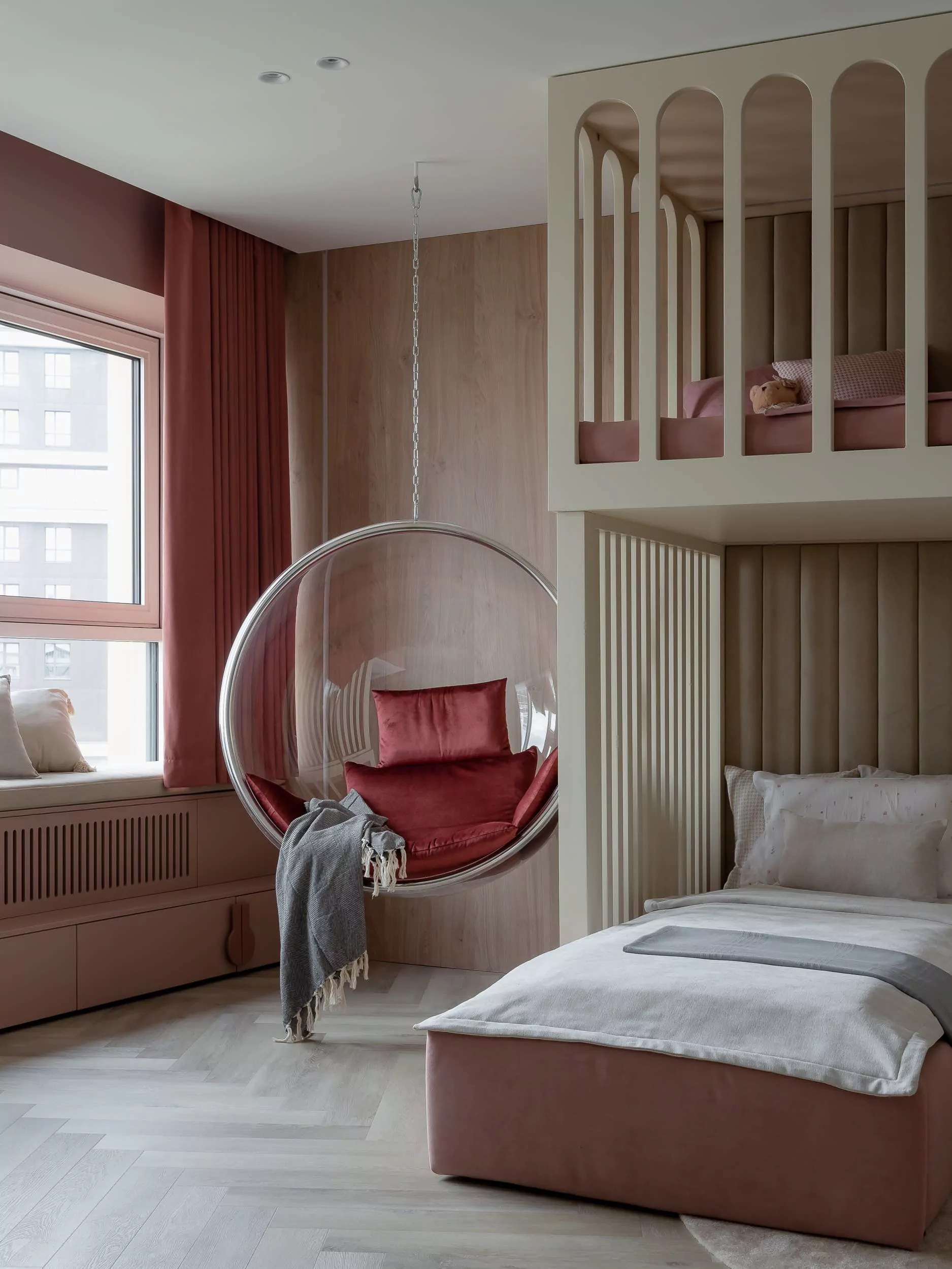 Живые фото реализованного интерьера в ЖК Клевер парк. Трапецевидные формы помещений радиальной квартиры добавили динамики, не потеряв в функциональности и эстетике. Мы использовали самые мягкие, пастельные и пудровые оттенки, чтобы добиться желаемого клиентам ощущения легкости и воздушности.