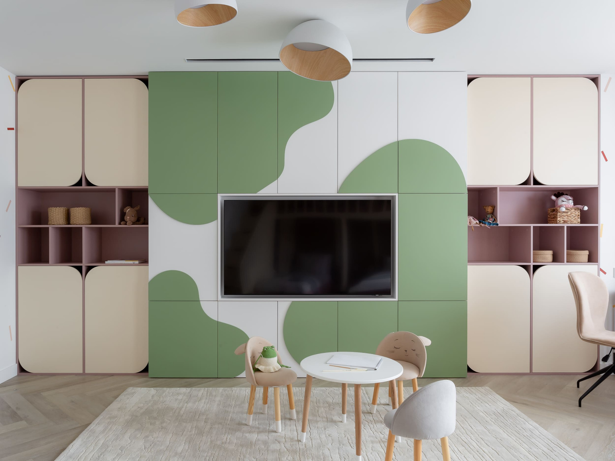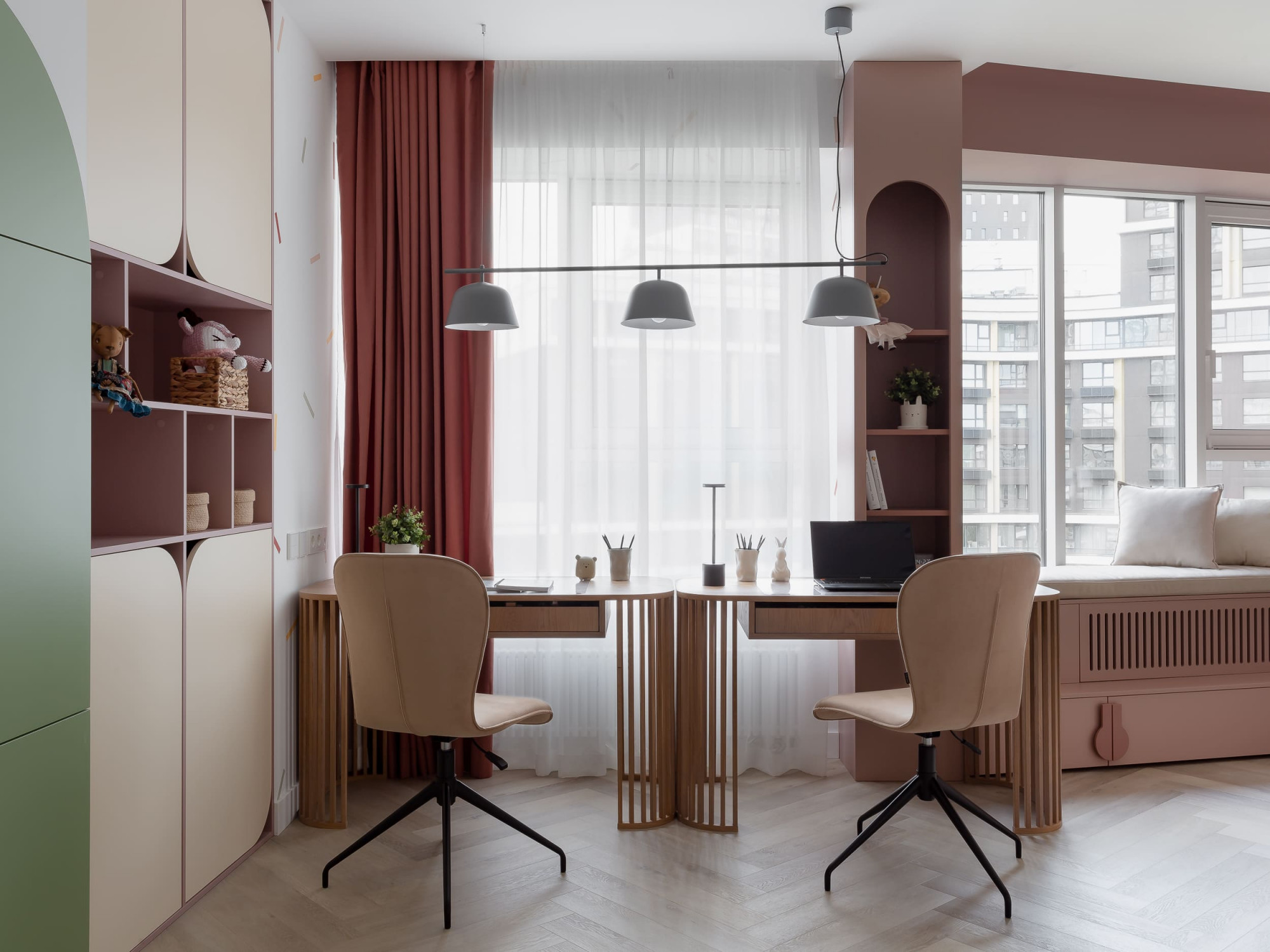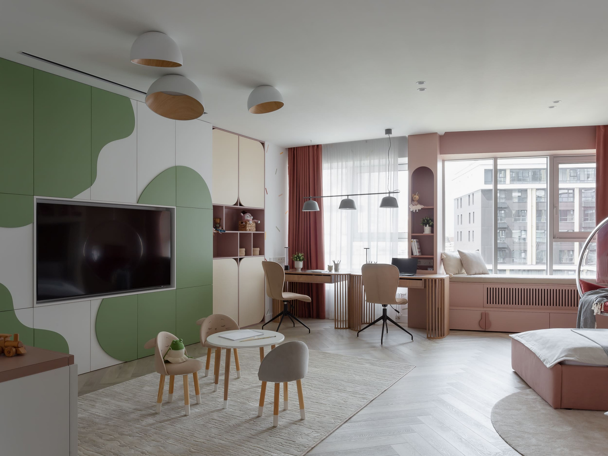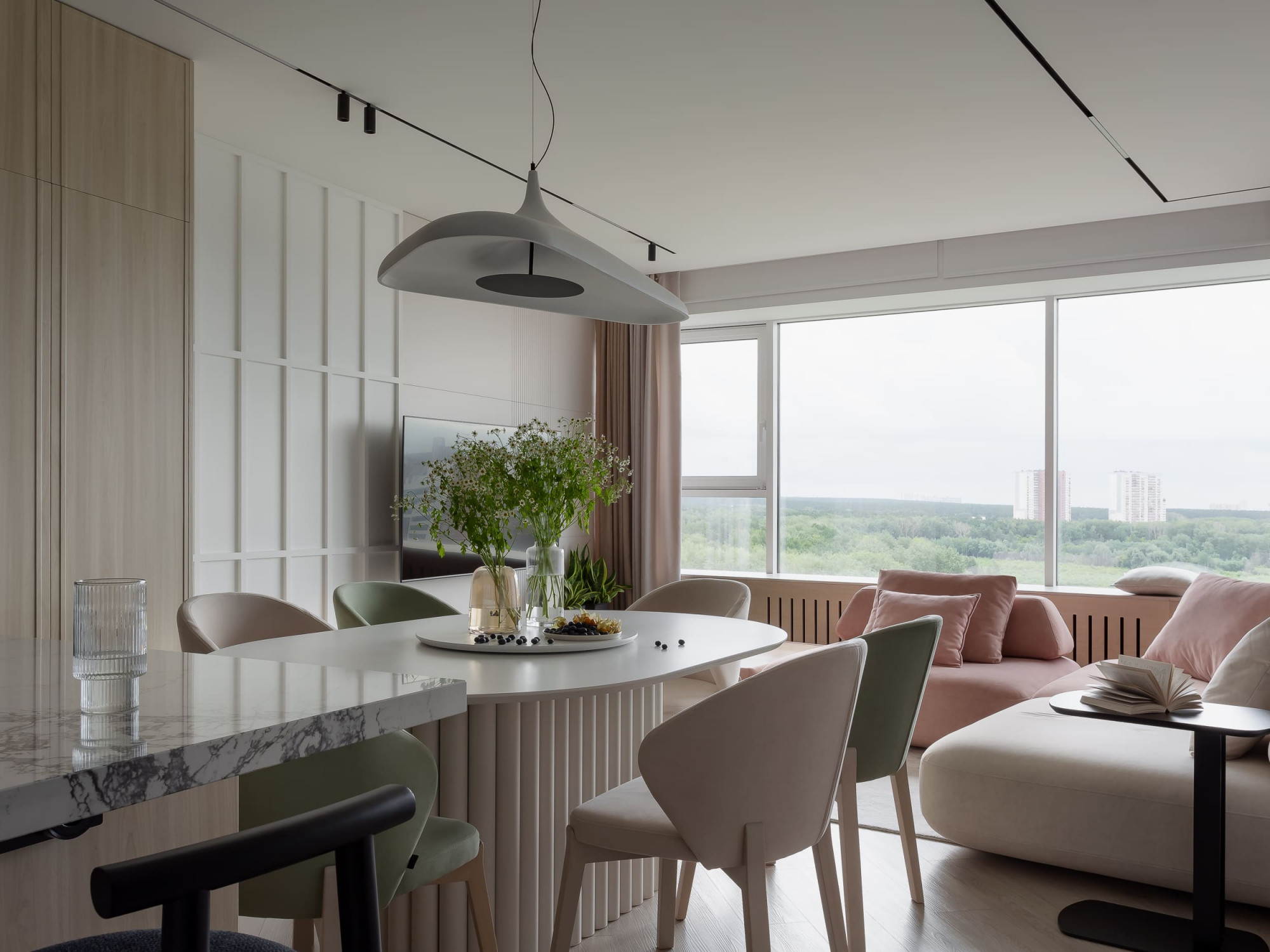 Живые фото реализованного интерьера в ЖК Клевер парк. Трапецевидные формы помещений радиальной квартиры добавили динамики, не потеряв в функциональности и эстетике. Мы использовали самые мягкие, пастельные и пудровые оттенки, чтобы добиться желаемого клиентам ощущения легкости и воздушности.