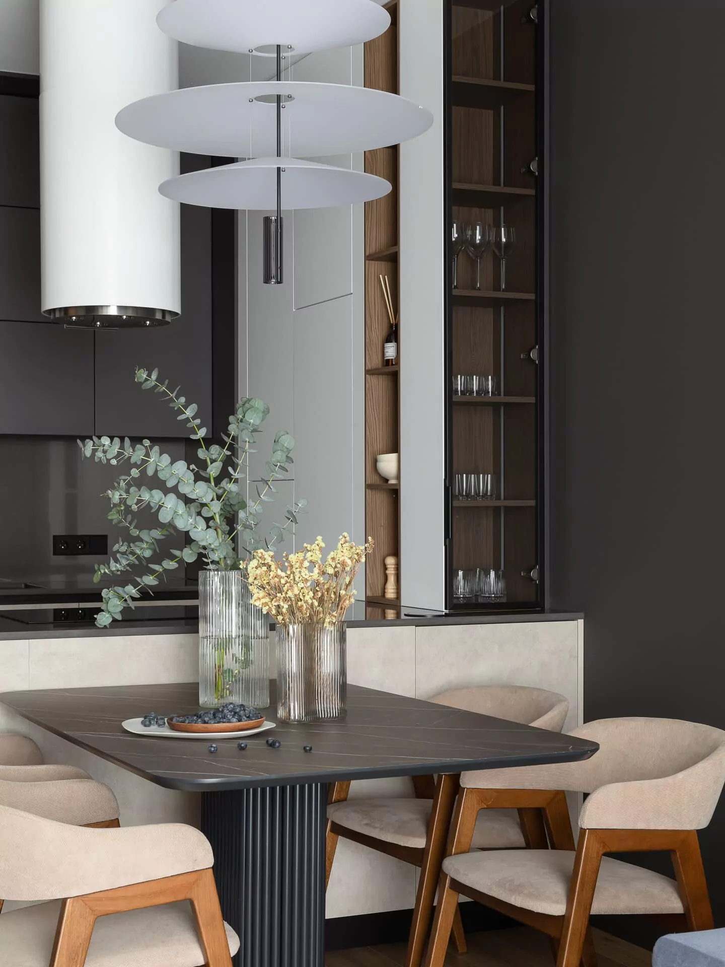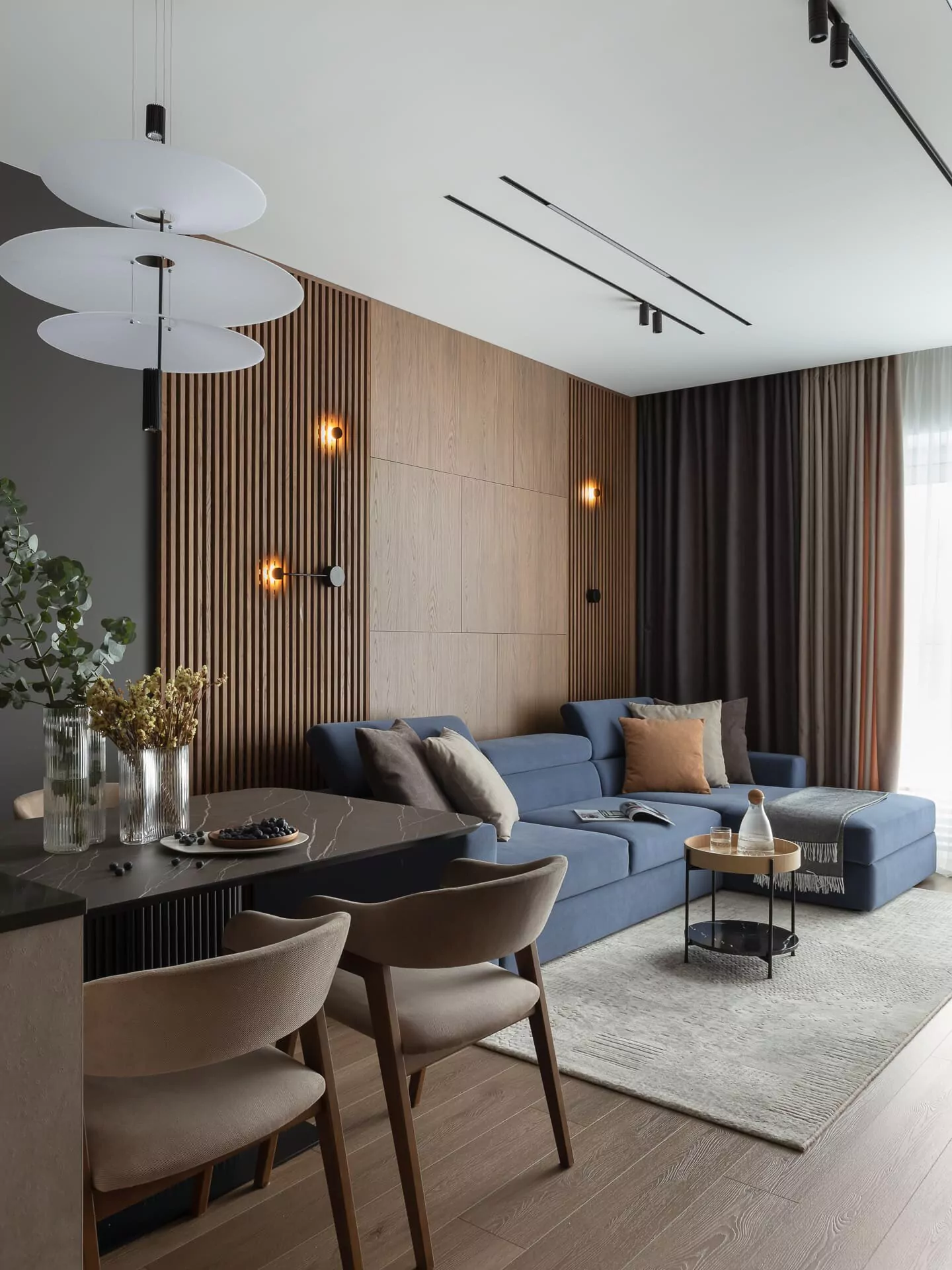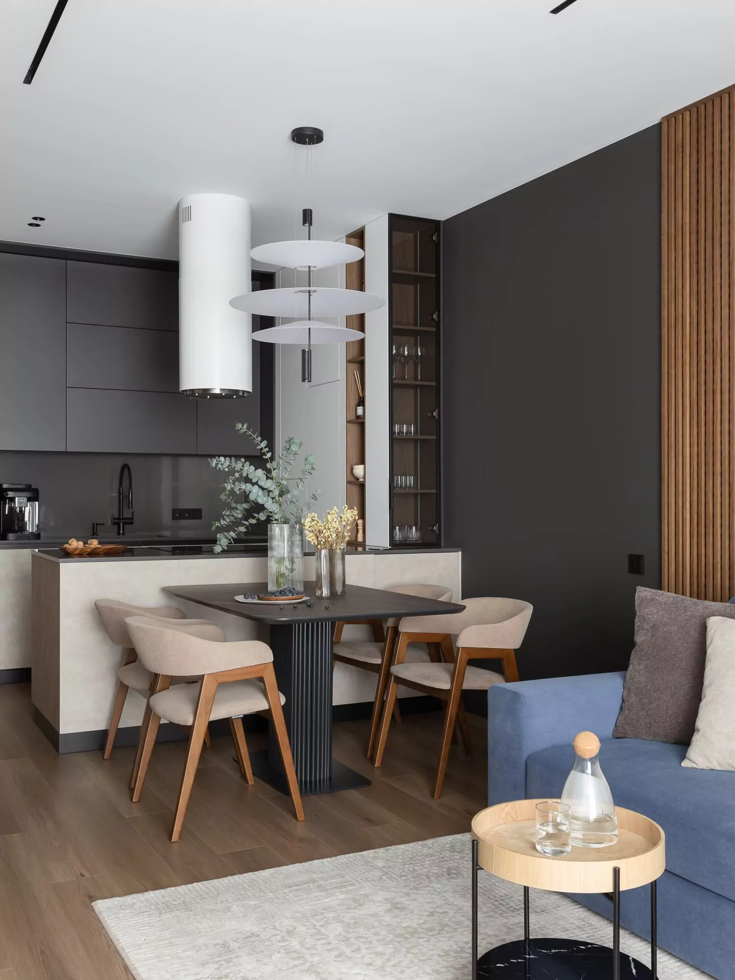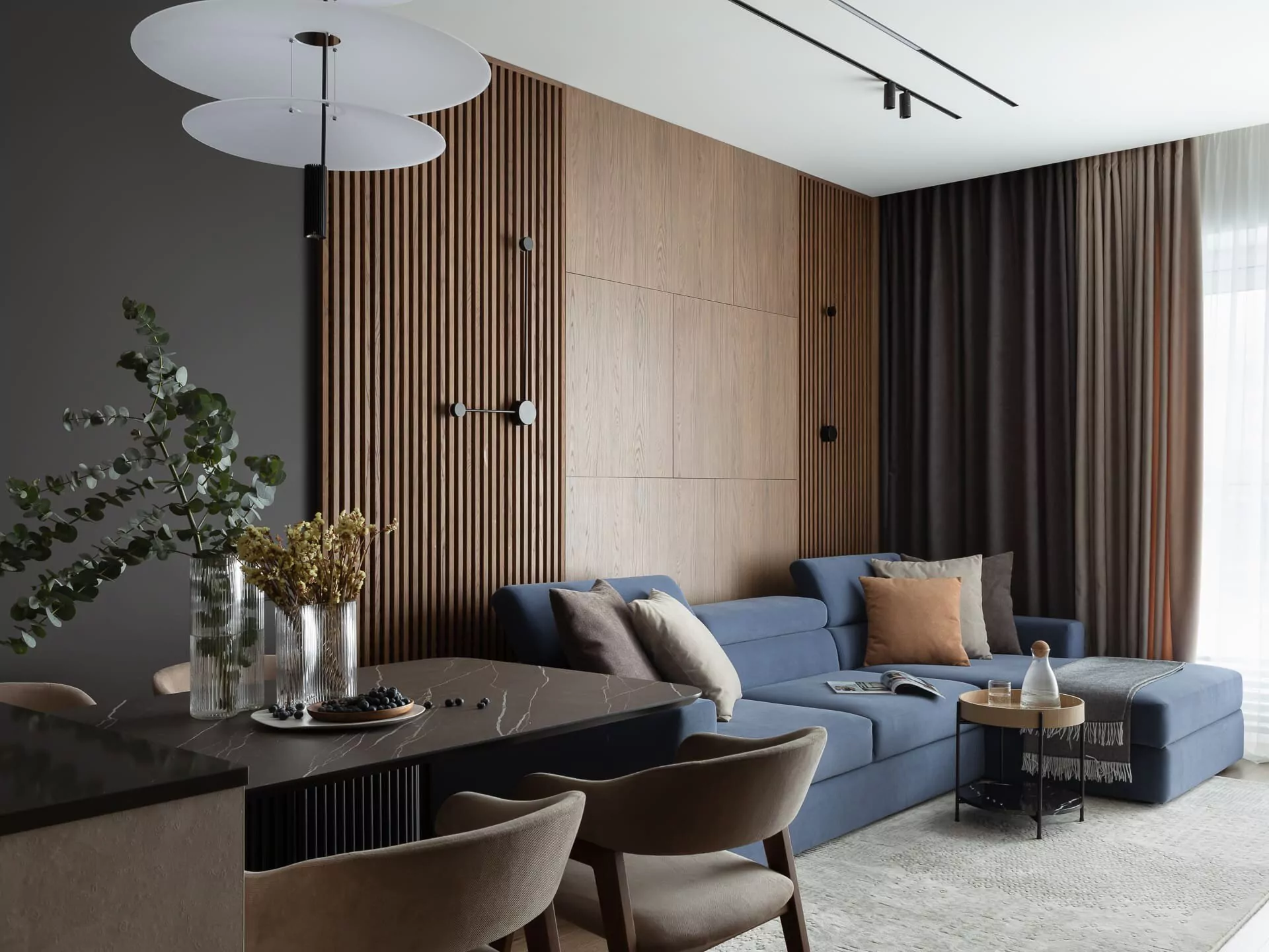Квартира 124 м² в ЖК «Клевер Парк» в Екатеринбурге — интерьер с характером и уверенной глубиной. В этом дизайне интерьера Neapol Design делает ставку на тёмные тона, графику и выразительные материалы: насыщенные древесные поверхности, матовые фактуры, контраст светлых плоскостей и акцентного света собирают пространство в цельный, «дорогой» силуэт. Общественная зона звучит как строгий фон для жизни — без суеты, с точными линиями и продуманной эргономикой. Это дизайн-проект квартиры, где уют рождается не из «воздуха», а из правильно выстроенного света, тактильности и спокойной силы композиции